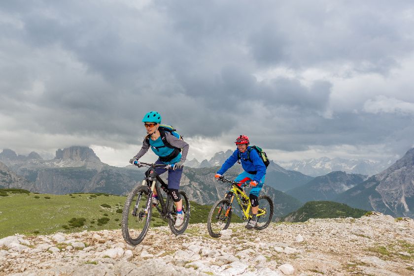 Ein Espresso kräftigt uns für den Aufstieg auf den Strudelkopf, einem mit dem Bike easy erreichbaren Gipfel, von wo aus man einen genialen Blick auf das Wahrzeichen Drei Zinnen haben würde (Konjunktiv weil wolkiges Wetter). Rund 40 Minuten brauchen wir nach oben, ein paar Sonnenstrahlen blitzen durch die dichten Wolken, vielleicht haben wir Glück und es reißt ein wenig auf!